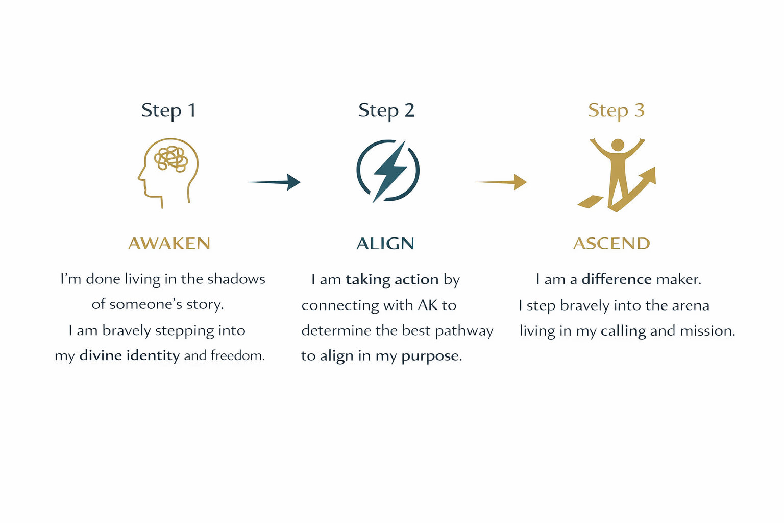 It’s my signature 3-step process designed to help you awaken into your true identity, align into your purpose, and ascend into the life and mission you are made for. It blends practical strategy with spiritual alignment so you can rise into your highest potential.
